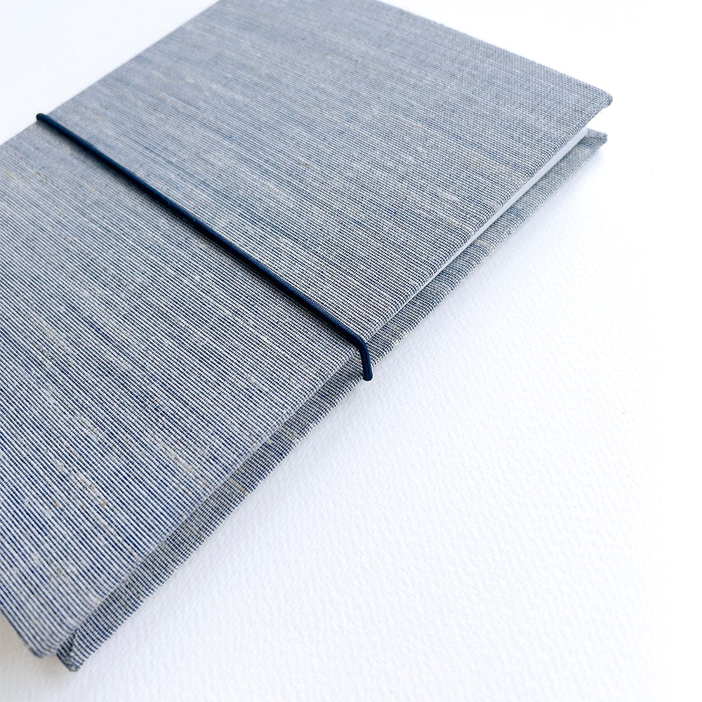 - hardback cover - blue bookcloth cover for structure and protection, choose navy or pink elastic