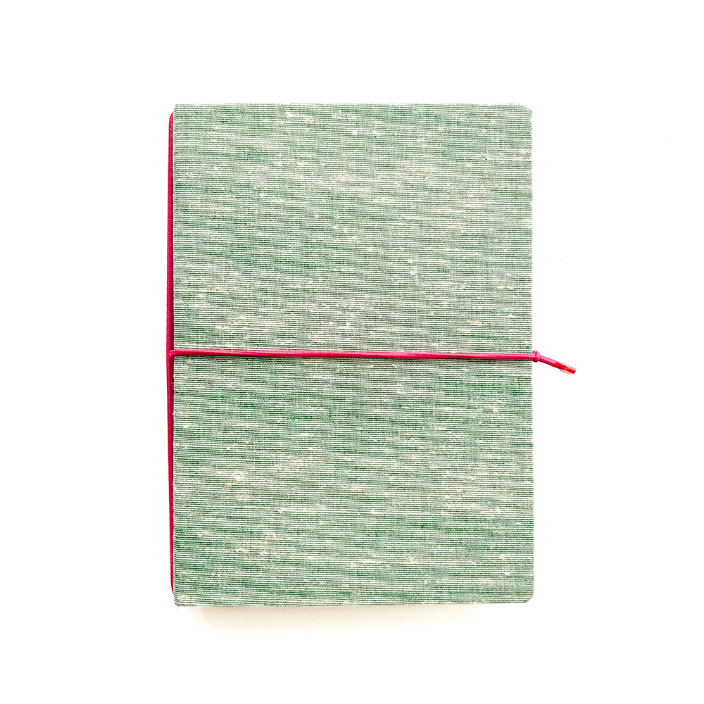 - hardback cover - green bookcloth cover for structure and protection, pink elastic